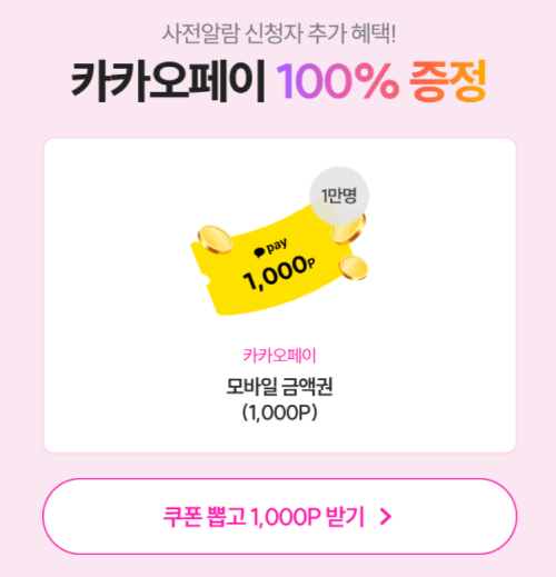 ☑️ 카카오페이 100% 증정 : 카카오페이 모바일 금액권 1,000P 을 증정.